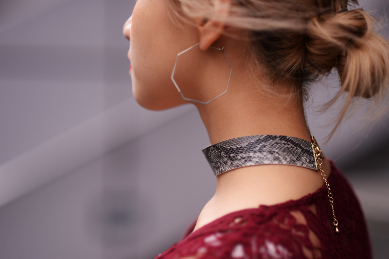パイソン柄をベルトと首元に。秋っぽくワインレッドの長めの袖。