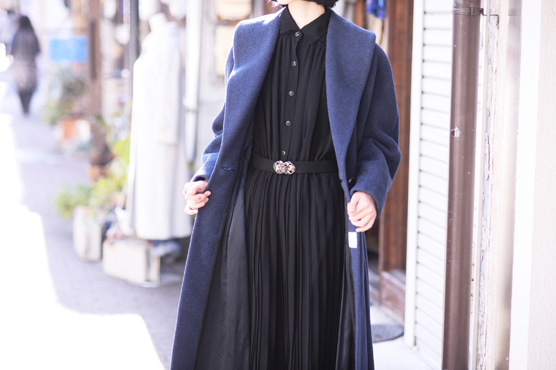 アウター(USED)、ワンピース(USED)、靴(WE GO)、カバン(USED)