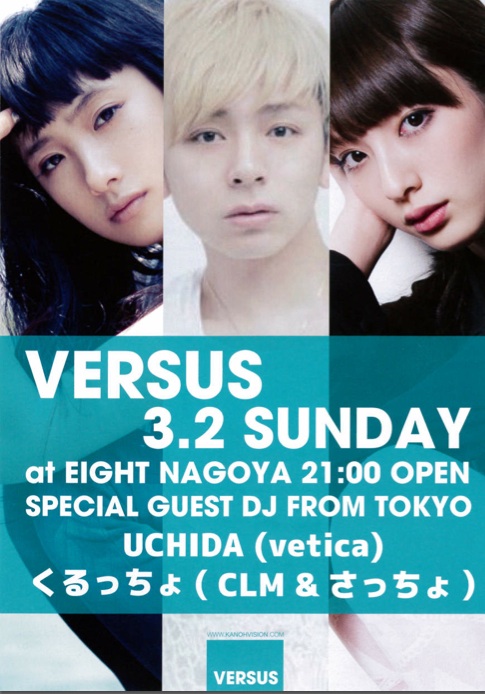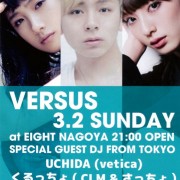 原宿にある美容院「vetica」のクリエイティブディレクターとして幅広く活躍中の“UCHIDA”氏がスペシャルゲストDJとして名古屋(eight nagoya)へやってくる。さらに、モデル活動を中心に女優、MCとしても活動する“CLM(中田クルミ)”、同じくモデル活動を中心にアパレルとコラボアイテムを開発するなど幅広く活躍中の“さっちょ(佐藤さき)”を迎えてのスペシャルナイト。 迫ってきた「VERSUS」に乞うご期待!