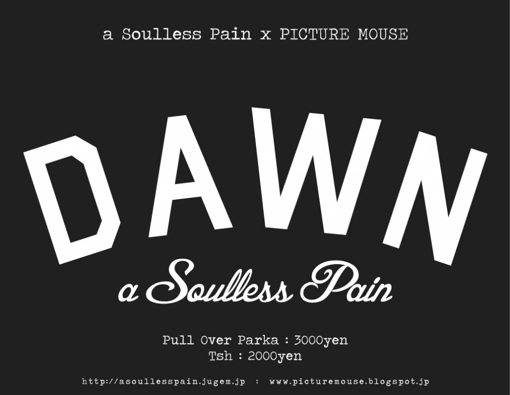 先日1stフルアルバム「繋ぐ世界」を発売した注目ハードコアバンド「a Soulless Pain」と名古屋を中心に数多くのバンドグッズを手掛ける「PICTURE MOUSE」によるアーティスティックなコラボTシャツとパーカが完成。12月28日(土)上前津Zionにて開催されるリリースパーティから発売が決定。また30日(月)にはZEPP名古屋で開催される“TWIM BOMB NIGHT”にて「the HIATUS」・「ASPARAGUS」との対バンも決定している。勢いを加速させるバンドとのコラボアイテムは即SOLD OUTの予感!