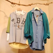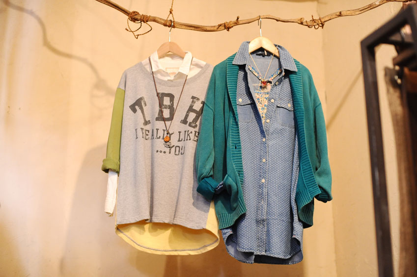 (右)水玉ロングシャツ/¥6195(Bliss Bunch) 綿ニットカーディがン/¥5145(Bliss Bunch)