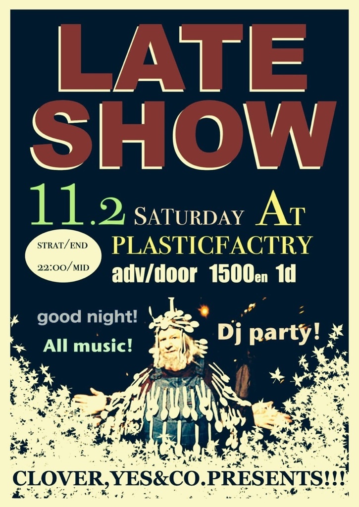 本日開催される“LATE SHOW”は、かつてから交流の深かった大須の古着ショップ『YES AND CO』と鶴舞の古着ショップ『CLOVER』の二店舗合同によるDJナイトパーティー。古着を中心にファッション好きが多く集まるので、最高の交流の場となりそうだ。異国情緒溢れる隠れ家的なクラブ「PLASTIC FACTORY」にて、個性豊かなDJ達による心地良い音楽と美味しいお酒で最高の一夜を過ごせそうです!