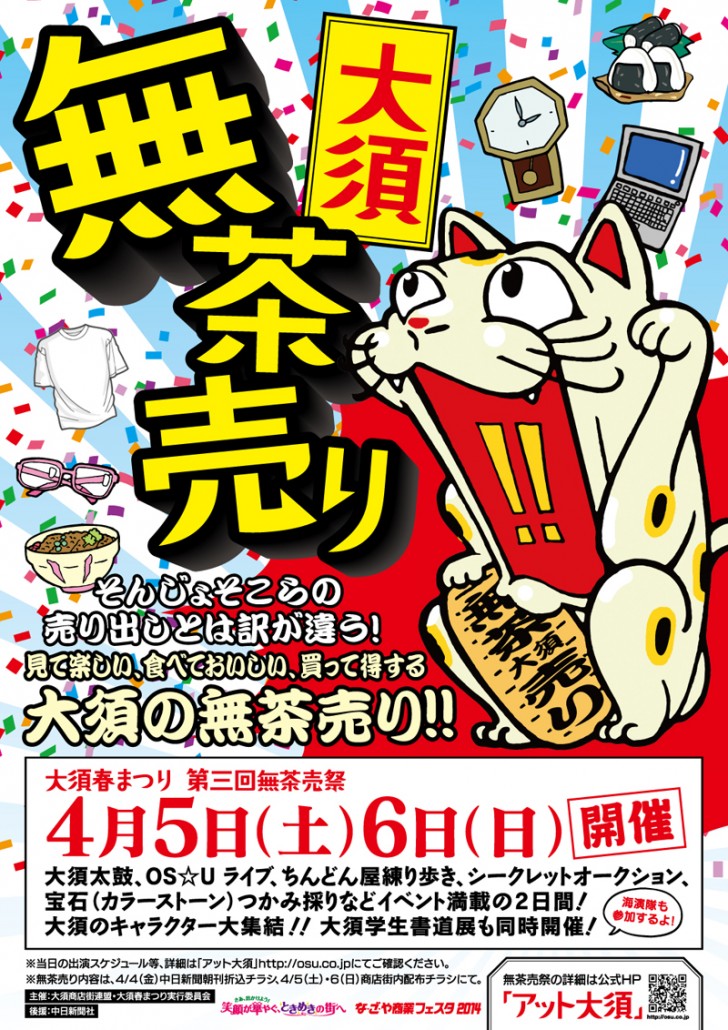 桜も満開を迎えポカポカ陽気で気持ち良い今日この頃。いよいよ今週末に迫った、大須春まつり“第3回無茶売祭”はとにかくア・ツ・イ♪ 今年も大須商店街の様々な店舗が無茶な売出しをしちゃいます。「こんなもの売ってるの!?」 「超激安!?」「じゃんけんで勝てば天国、負ければ地獄!?」といったココでしか味わえない「見て楽しい、食べておいしい、買って得する」二日間。特に気になるのは、大須演芸場で寄席を行っていた『海演隊』のデリバリー寄席、略して“デリ寄席”。9,999円で名古屋市内ならどこでも出張寄席を行ってくれるらしい(限定3組)。無茶な売出しのみならず、お祭りを一層盛り上げてくれるOS☆Uのライブやちんどん屋の練り歩き、大須のキャラクターが大集結するなど目白押しな企画が満載。今週末は是非大須へ!