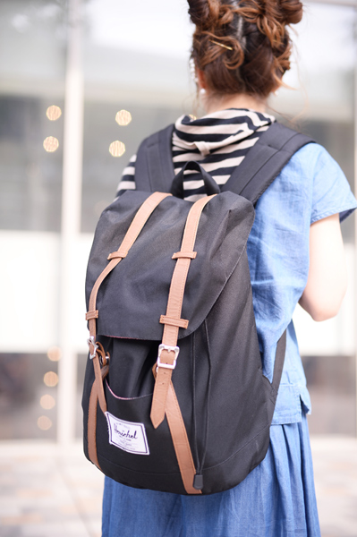 トップス(LEPSIM)、ボトムスLEPSIM)、靴(BIRKENSTOCK)、リュッック(Herschel Supply)、時計(CASIO)、眼鏡(GLOBAL WORK)