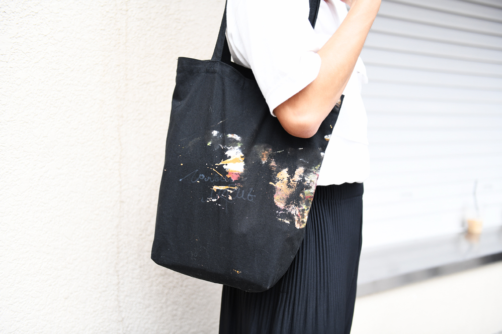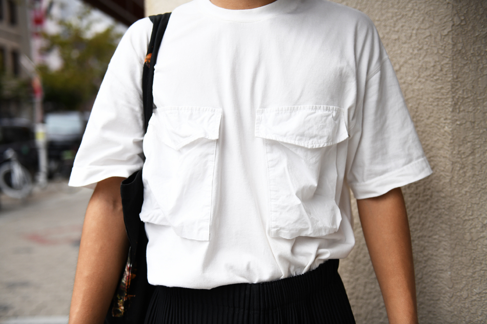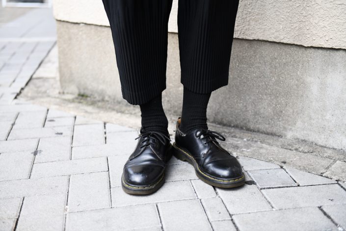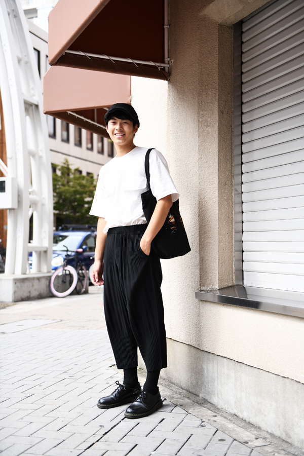 トップス(M・C・W)、ボトムス(ISSEY MIYAKE)、靴(Dr.Martens)、カバン(NOUVELLE NORME)
