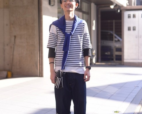 ベレー帽、ボーダーカットソー(ともにUSED)、アイウェア(Ray-Ban)、デニムパンツ(UNITED…