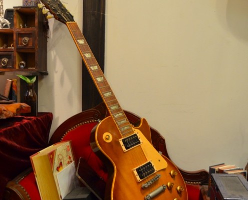 20歳の時から大事にしているギター。バンド経験のある角さん、お店に大切に保管しているが、たまに弾いてみることもあるとか。3本持っているギターの中でも、「スタジオに行く際に必ず持っていく一本がコレ」。がしかし、実際にはドラム担当の角さん(笑)。最近購入したモノはバイク!…