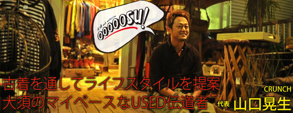 最初は若宮大通沿いの2階でした。そこで4年くらいやって、それからは赤門通りのお店で今に至るという感じです。初めから今の店名の『CRUNCH』のまま変わらずにやってますよ。由来も、テナントを決める際の1週間くらいで決めて、準備も何も、古着の買い付けのルートも知らずに始めてしまったんです(笑)。でも、元々海外旅行は好きで、向こうに行ったらお菓子も集めてたり、色んな物を買ってた中に“CRUNCH”っていうアイスクリームがあって、奥さんの「これでいいんじゃない!? 」っていう後押しもあり、決まった感じです。そのままの書体を使って、作りました。25歳から始めて今年で9年目、本当に名前は急遽決めたので、何の理由も意味もないです。ただ好きだから。