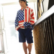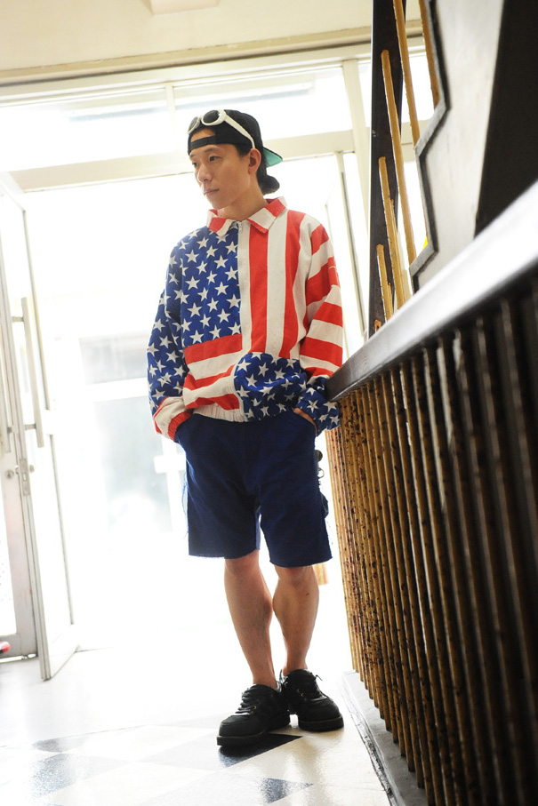 - キャップ/¥6696(FUCT)【SIZE:フリー】、フラッグジャンパー/¥5940(USED 、リメイクショーツ/¥22680(third hand creation)【SIZE:M】、サングラス/¥19440(BLACK EXPERIENCE) ※全て税込