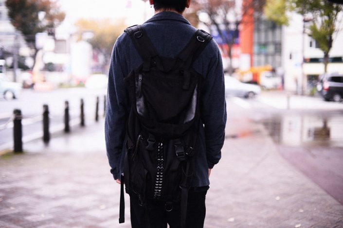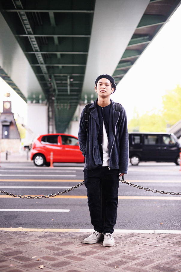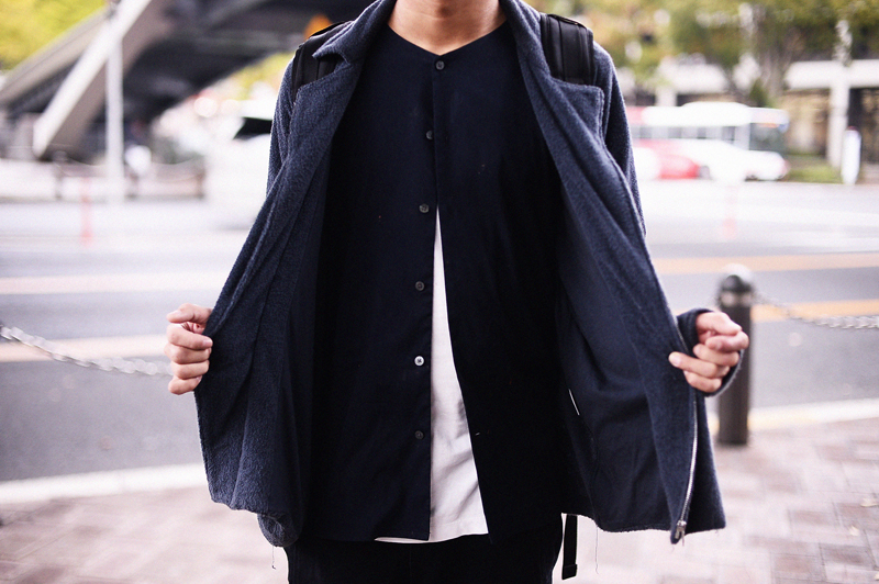 アウター(LAD MUSICIAN)、トップス(STUDIOS)、ボトムス(USED)、靴(VANS)、帽子(CA4LA)、カバン(MEMENTISM)