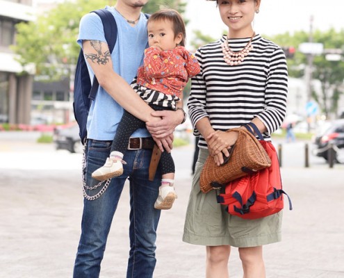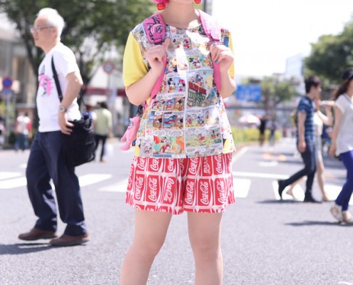 シャツ(USED)、Tシャツ(大竹伸朗)、デニムパンツ(USED)、スニーカー(NIKE)、バックパック(MEI)