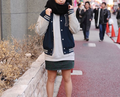 スタジャン(USED)、スウェット(USED)、スカート(USED)、ブーツ(USED)、バックパッック(EASTPAK)