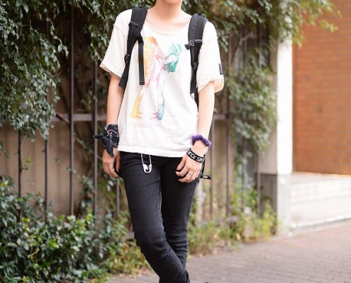 Tシャツ(STUSSY)、スカート(Kitsune)、スニーカー(adidas)、キャップ(STUSSY)、バッグ(COMME…