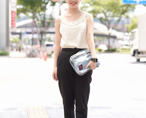 サマーニット(USED)、パンツ(EMODA)、パンプス(BEAMS)、クラッチバッグ(USED)