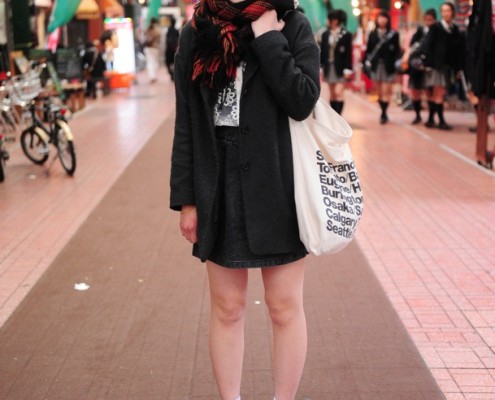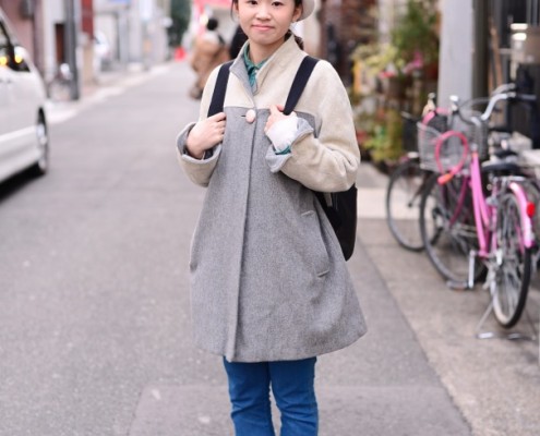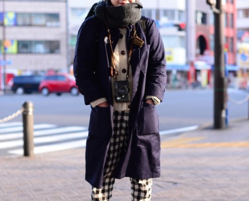 コート(Lala)、ロングシャツ(Lala)、パンツ(Lala)、スニーカー(convers)、帽子(?)、リュック(WHO'S…