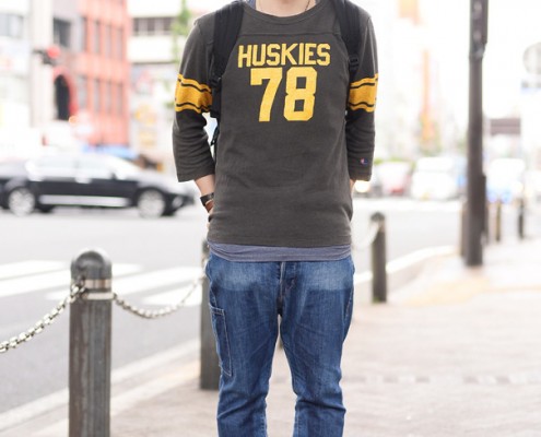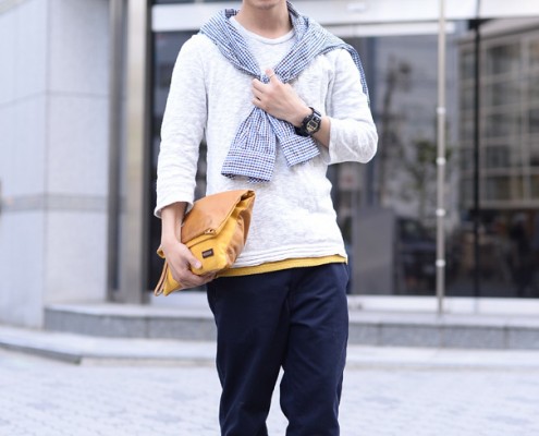 七分袖シャツ(BEAMS)、デニムパンツ(CABANE…