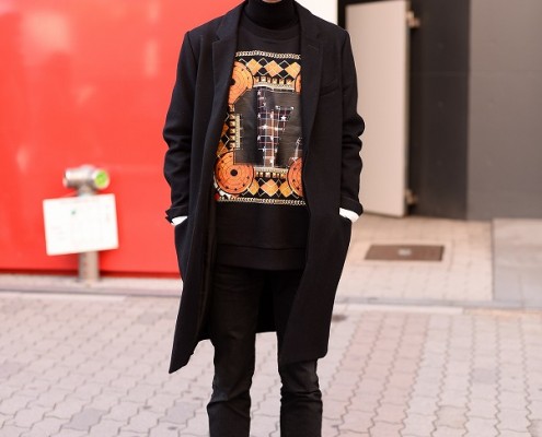 コート(CARVEN)、スウェット(GIVENCHY)、パンツ(soe)、ブーツ(White…