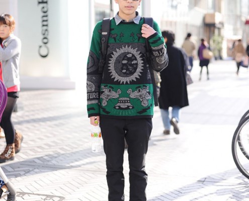 ニット(USED)、パンツ(USED)、スニーカー(Reebok)、キャップ(Supreme)、バックパック(USED)