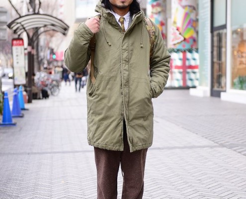 コート(USED)、パンツ(Gramicci)、タッセルローファー(USED)、バッグ(MYSTERY…
