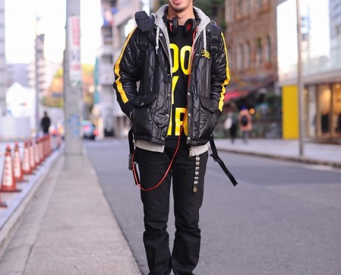 ダウンジャケット(COOTIE)、パンツ(UNIQLO)、スニーカー(adidas)、バックパック(STUSSY)
