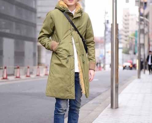 コート(RICO)、デニムパンツ(USED)、スニーカー(NIKE)、バッグ(JAM…