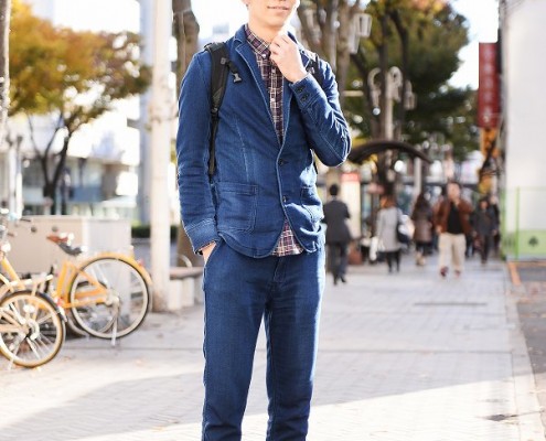 ジャケット(UNIQLO)、スニーカー(VANS)、バッグ(無印良品)