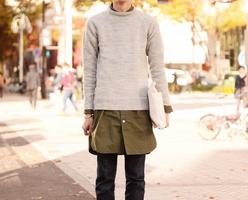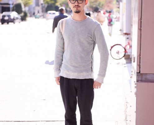 パーカ(USED)、ショートパンツ(GU)、スニーカー(VANS)、ニット(patagonia)