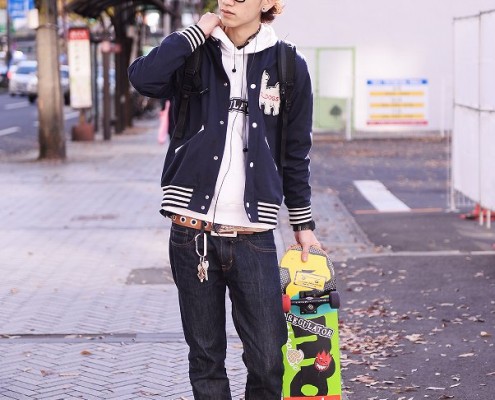 スタジャン(Supreme)、パーカ(REGULATOR)、スニーカー(NIKE)、バックパック(Gravis)、メガネ(Reminence)