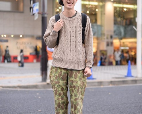 ニット(USED)、ミリタリーパンツ(USED)、ローファー(USED)、キャスケット(USED)、メガネ(SHURON)