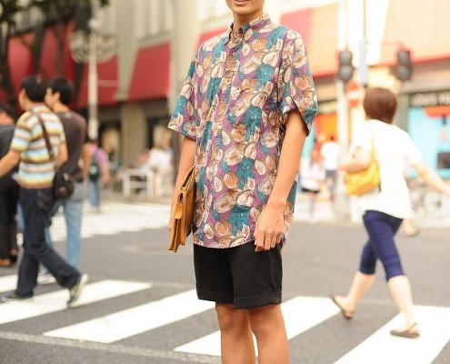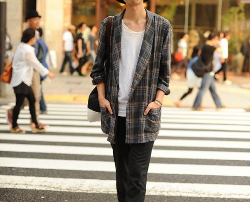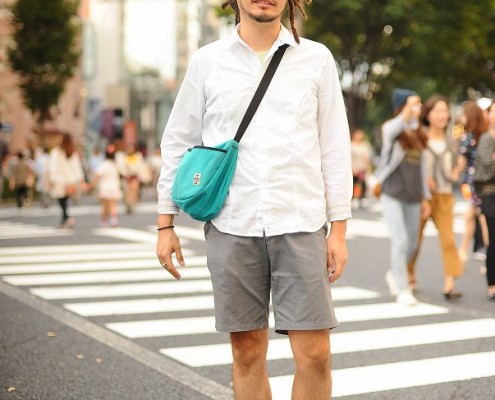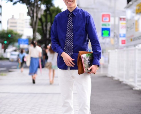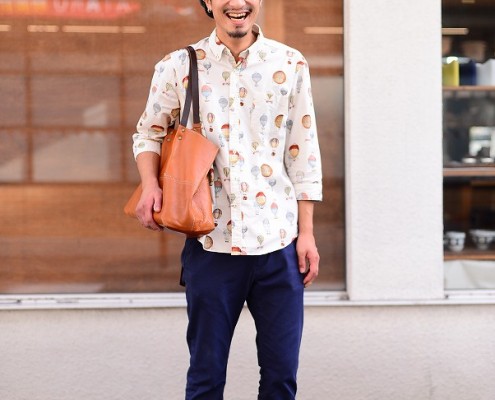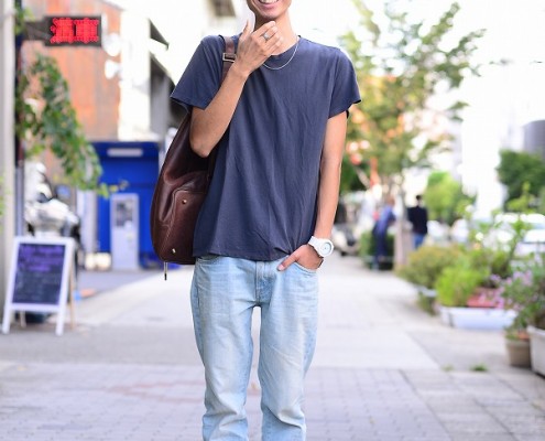 シャツ(soe)、デニムパンツ(J.SABATINO)、ローファー(USED)、クラッチバッグ(USED)、メガネ(ROBERT…