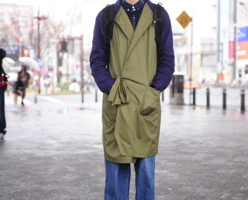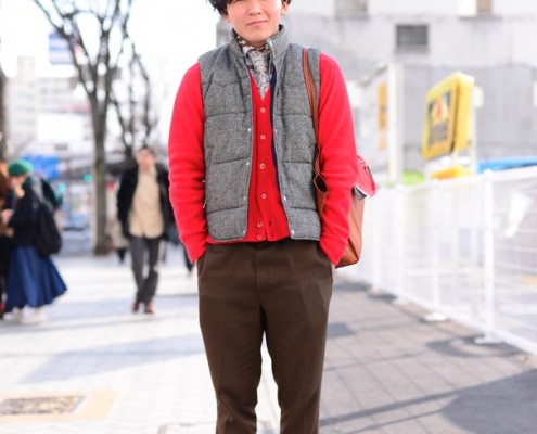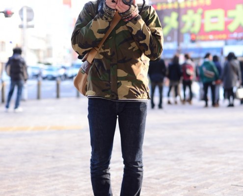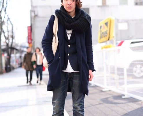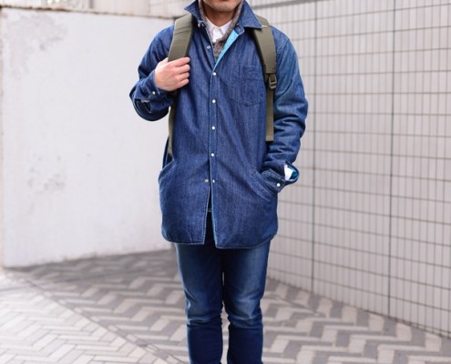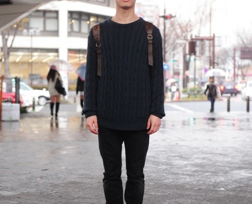 ジャケット(USED)、セーター(USED)、デニムパンツ(UNIQLO)、靴(L.L.Bean)、リュック(Incase)