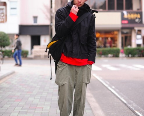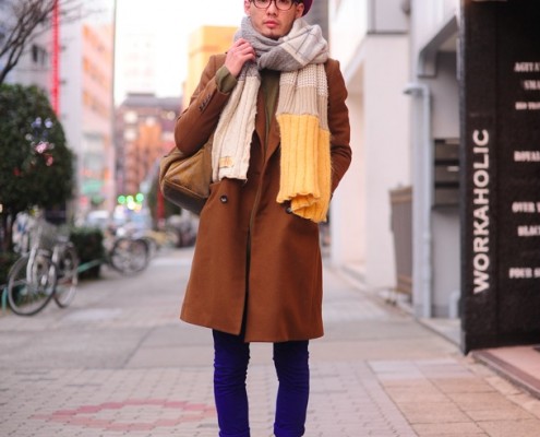 ベレー帽(もらいもの)、ジャケット、ニット、シャツ、デニムパンツ(以上USED)、スニーカー(NIKE)、バッグ(ブランド不明)