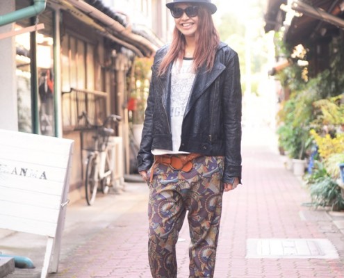 レザージャケット、ブーツ(ともにUSED)、ブラックデニムパンツ(UNIQLO)、トートバッグ(毛皮のマリーズ)