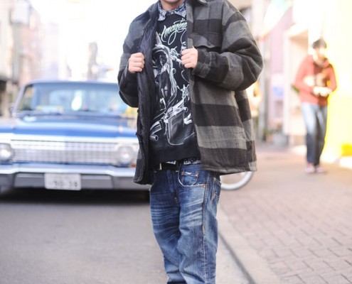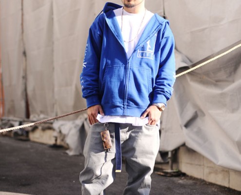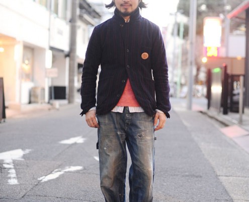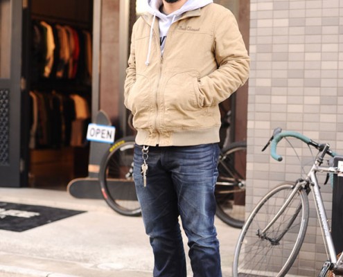 ジャケット(YAGO)、スウェット(DGA)、パンツ(Levi’s)、スニーカー(NIKE)、キャップ(NEW…