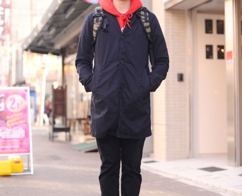 ミリタリージャケット(USED)、パンツ(USED)、スニーカー(NIKE)、バックパック(PORTER)、時計(NIXON)