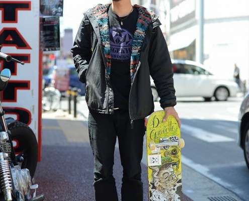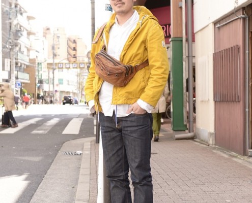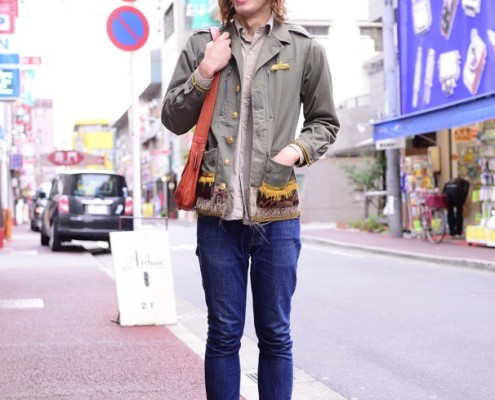 ミリタリージャケット(USED)、シャツ(USED)、パンツ(Levi's)、ブーツ(Dr.Martens)、ニット帽(NEW…