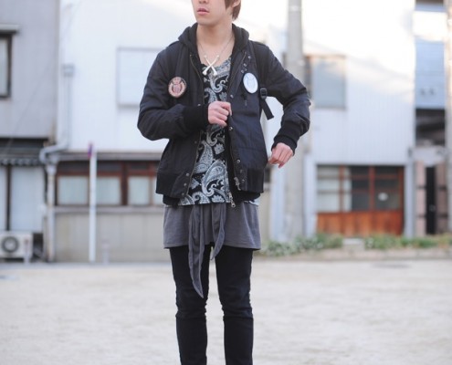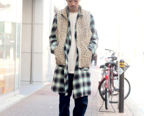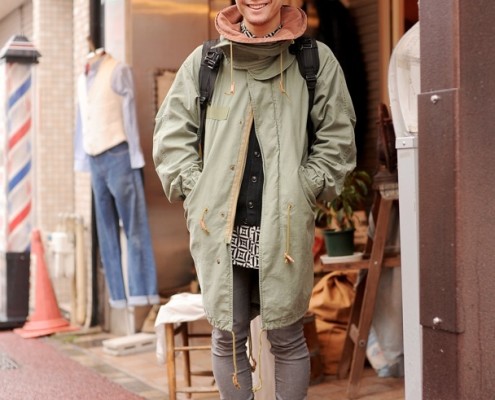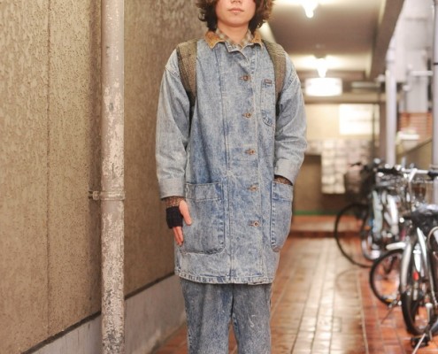 パーカー(リメイク古着)、ブラウス(USED)、オーバーオール(USED)、スニーカー(GERMAN…