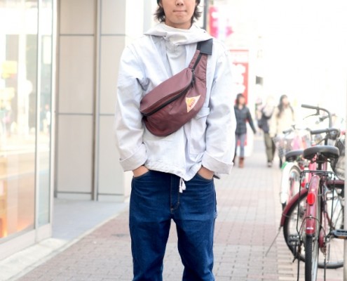 フード付きトップス(USED)、デニム(USED)、スニーカー(VANS)、ニット帽(Carhartt)、ウェストポーチ(KELTY)