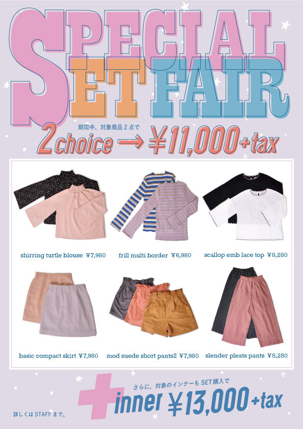 コンセプトはLove & Joy!ガーリーなオリジナルアイテムを展開する女の子ショップ『flower』。同ショップの名古屋店・堀江店では、2月7日(火)〜14日(火)の期間スペシャルセットフェアを開催する。このセットフェアでは、トップスとボトムスの計6種類のアイテムから2点を選択して購入すると少しお得な11,000円にて提供されるといったもの。さらに対象のインナーアイテムも追加購入で13,000円とさらにお得が増します。春に向けてあなた好みのアイテムが見つかったセット購入をおすすめ♡